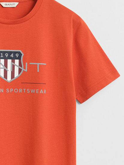 Introducing the Archive Shield T-Shirt for boys, a perfect blend of style and comfort. This vibrant orange tee features a striking graphic pattern that adds a playful touch to any outfit. Crafted from soft organic cotton, it ensures a gentle feel against the skin, making it ideal for everyday wear. The regular fit offers a relaxed silhouette, while the short sleeves and round neck provide classic appeal. With a convenient pull-on closure, dressing is a breeze. Elevate your childs wardrobe with this versatile and eco-friendly choice.