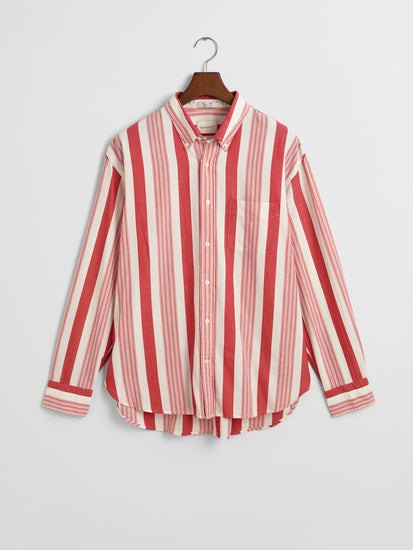 Embrace effortless style with this relaxed-fit, full-sleeve button-down shirt. Crafted from a soft cotton blend, it boasts a classic striped pattern in vibrant red, adding a touch of sophistication to your everyday look. The relaxed fit ensures ultimate comfort, while the button-down collar provides a polished finish. Perfect for casual outings, weekend adventures, or layering under a blazer for a smart-casual ensemble.