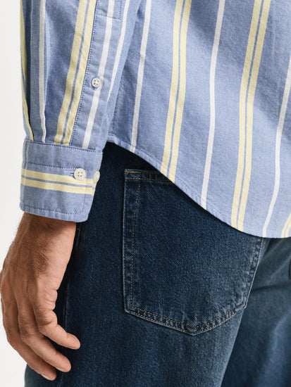 A timeless classic, this blue striped shirt is crafted from pure cotton for breathable comfort. The regular, untucked fit allows for effortless movement, while the full sleeves and button-down collar add a touch of sophistication. Perfect for casual Fridays or weekend outings, this shirt is a versatile wardrobe staple that will never go out of style.
