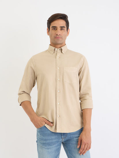 Embrace timeless style with this beige button-down shirt. Crafted from soft, breathable organic cotton, it offers a comfortable regular fit. The full sleeves and classic button-down collar add a touch of sophistication, while the button closure ensures a secure and polished look. Perfect for casual outings or smart casual events, this versatile shirt is a wardrobe essential.