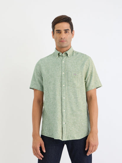 Embrace effortless style with this men's linen blend shirt. Crafted from a breathable and comfortable linen blend fabric, this regular fit shirt features a classic button-down collar, short sleeves, and a solid green hue. The button closure ensures a secure and polished look. Perfect for casual outings or smart casual occasions, this shirt offers both comfort and sophistication.
