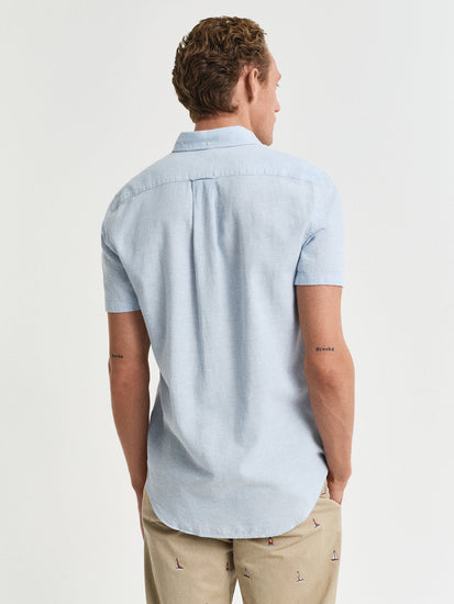 Stay cool and comfortable in this breezy linen blend shirt. Featuring a classic button-down collar, short sleeves, and a regular fit, this solid blue shirt is perfect for casual days. Button closure for a secure fit.