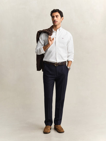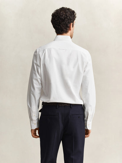 Elevate your wardrobe with the GANT Men White Slim Fit Oxford Shirt. Crafted with premium quality materials, this shirt offers a sleek and modern silhouette that effortlessly transitions from the office to a night out. The slim fit design provides a tailored look that flatters your physique, while the classic white color ensures versatility and timeless style. Whether dressed up with a blazer or worn casually with jeans, this shirt is a must-have staple for any man looking to make a sophisticated statement. Elevate your style game with GANT.