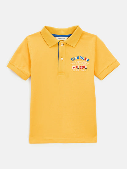 This yellow polo t-shirt is perfect for boys who love a classic look. It features a regular fit for comfortable wear and a short sleeve design for breathability. The polo collar adds a touch of sophistication while the button closure provides a secure fit. The embroidered flag pattern adds a unique touch to this stylish shirt. Made from pure cotton fabric this t-shirt is soft and comfortable to wear.