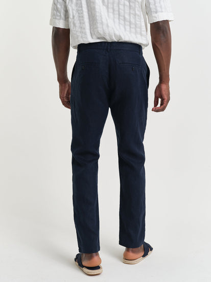 Effortlessly cool, these linen trousers offer a relaxed fit for ultimate comfort. The mid-rise waist and drawstring closure provide a personalized fit, while the solid blue hue adds a touch of sophistication. Perfect for warm days, these trousers are breathable and stylish.