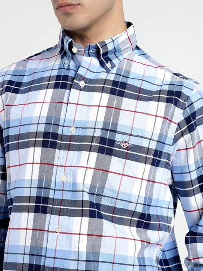 Elevate your everyday style with GANT Men Multicolour Cotton woven checked button down collar long sleeves shirt. Made with premium cotton fabric.This shirt offers a comfortable fit and a timeless checkered pattern that adds a classic touch to any outfit. With a button-down collar and long sleeves.This versatile shirt can effortlessly take you from work to play. The regular fit ensures a flattering silhouette, making it a wardrobe essential for the modern man who values both style and comfort. Upgrade your wardrobe with this versatile and stylish shirt today.