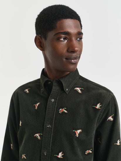 Fashion-forward men will surely love the design of this GANT shirt. Tailored to perfection, this corduroy shirt features embroidered bird motifs for added sophistication. Featuring a button-down collar and pleat-loop styling at the back, it looks extremely voguish. Team it with contrast-coloured chinos.