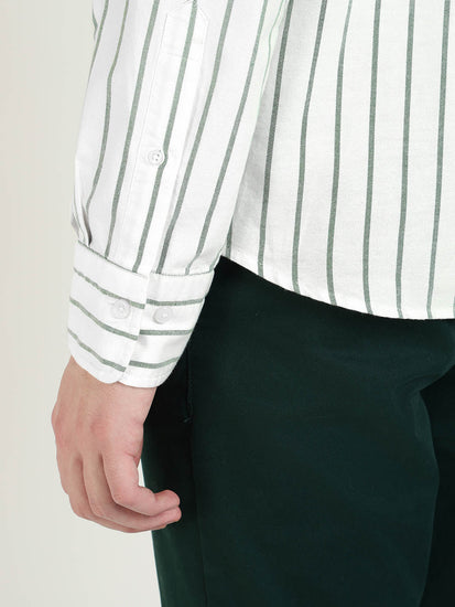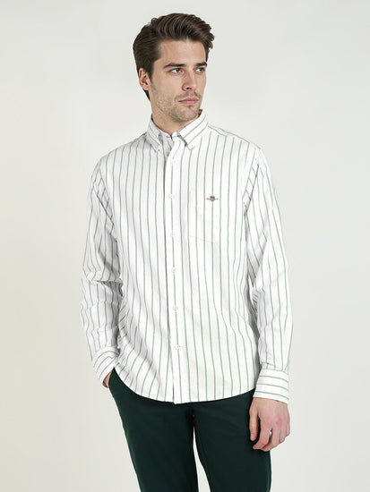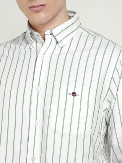 Elevate your everyday style with the GANT Men White & Green Cotton shirt. Crafted from premium cotton with a sleek woven stripes design.This button-down collar shirt offers a perfect blend of classic sophistication and modern flair. The long sleeves and regular fit provide a comfortable and tailored look, making it the ideal choice for any occasion. Whether you are heading to the office or a night out. This versatile shirt will keep you looking sharp and stylish. Upgrade your wardrobe with this must-have piece that effortlessly combines quality craftsmanship and timeless elegance.