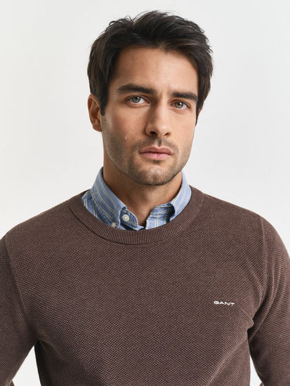 Elevate your wardrobe with our cotton pique pullover sweater in a rich brown hue. Designed for the modern man, this sweater offers a regular fit that ensures comfort and style. Crafted from pure cotton fabric, it provides a soft touch and breathability, making it perfect for any season. The solid pattern adds a timeless appeal, while the full sleeves and crew neck offer a classic look. With a convenient pull-on closure, this sweater is easy to wear and versatile enough for both casual and semi-formal occasions.