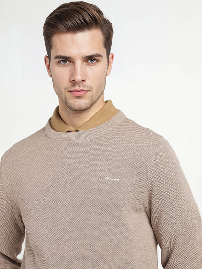 Elevate your casual wardrobe with the GANT Men Beige Cotton knitted Textured crew neck Sweater. Crafted from soft cotton. This regular fit pullover features long sleeves for all-day comfort and style. The subtle textured design adds a touch of sophistication, making it perfect for both work and play. Stay cozy and effortlessly stylish with this versatile sweater that will quickly become a staple in your wardrobe.