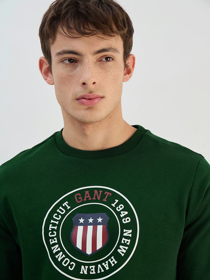 Elevate your casual wardrobe with the GANT Men Green Solid Round Neck Sweatshirt. Crafted from premium quality materials, this sweatshirt offers both style and comfort. The solid green color adds a pop of color to your outfit, while the round neck design keeps you looking effortlessly cool. Perfect for layering or wearing on its own, this sweatshirt is versatile and easy to style. Whether you are running errands or meeting friends for coffee, this GANT sweatshirt will keep you looking and feeling great all day long. Upgrade your wardrobe with this must-have piece.