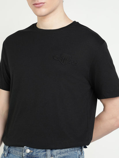Elevate your casual wardrobe with the GANT Men Black Cotton knitted crew neck T-shirt. Crafted from soft cotton. This short-sleeved pull-over features a regular fit that offers both comfort and style. The solid black color adds versatility to your outfit choices, while the crew neck design gives a classic touch. Perfect for everyday wear. This t-shirt is a must-have staple for any modern man's wardrobe. Upgrade your style effortlessly with this timeless and versatile piece from GANT.