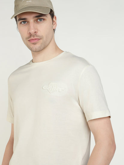 This GANT Men Cream Cotton knitted crew neck T-shirt crafted from premium cotton. This short-sleeve pull-over features a regular fit for all-day comfort. The solid design offers versatility for any occasion, while the crew neck adds a classic touch. Whether you are dressing up or down. This T-shirt effortlessly combines style and comfort, making it a must-have staple in your wardrobe.