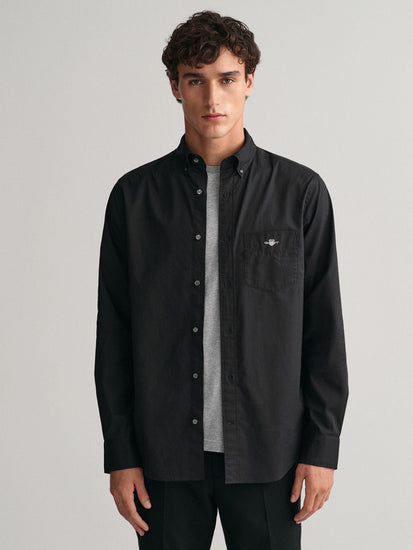 Discover timeless style with our classic poplin shirt in sleek black. Designed for the modern man, this regular fit shirt offers a sophisticated look with its solid pattern and full sleeves. The button-down collar adds a touch of elegance, making it perfect for both casual and formal occasions. Crafted from pure cotton fabric, it ensures comfort and breathability throughout the day. The button closure provides a secure fit, while the high-quality material promises durability. Elevate your wardrobe with this versatile essential.
