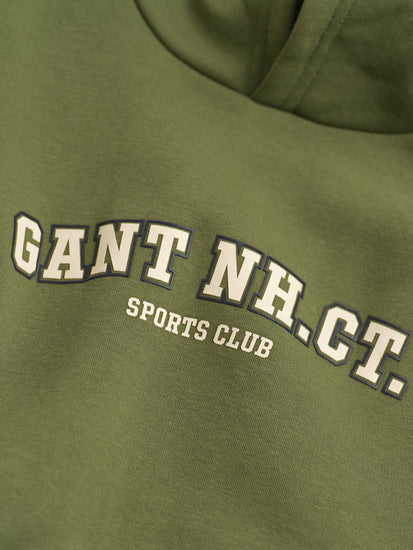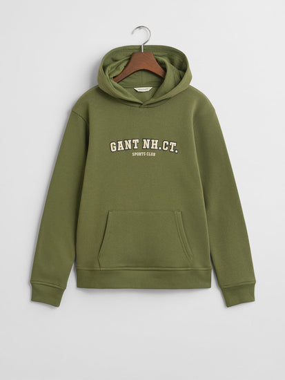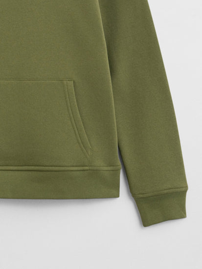 The sweatshirt hoodie is olive green and has a graphic design. It is made of cotton fabric. Pull-over style with a hood and long sleeves. It does not stretch. Works well for everyday use. Simple and easy to wear.