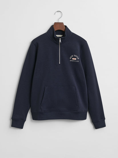 This boys sweatshirt comes in evening blue shade and is made of cotton and recycled polyester fabric. It has a mock neck with a half zipper. The graphic print follows the trend. Full sleeves and non-stretchable. Suitable for school or casual play.