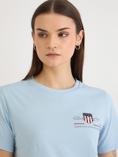 This women's regular fit t-shirt is a classic wardrobe staple. Crafted from pure cotton it offers a comfortable and breathable feel. The short sleeves and crew neck provide a timeless look while the embroidered pattern adds a touch of style. The pull-on closure makes it easy to wear and the stretchable fabric ensures a comfortable fit. This regular archive shield t-shirt is perfect for everyday wear.
