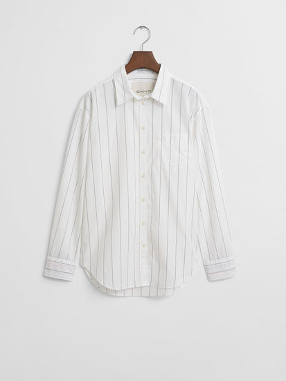 Embrace effortless style with this breezy white striped shirt. Crafted from pure cotton, it drapes beautifully in a relaxed fit, offering ultimate comfort. The classic spread collar adds a touch of sophistication, while the full sleeves provide coverage and a timeless appeal. Perfect for casual days or dressed up with your favorite jeans or skirt, this shirt is a wardrobe essential for every woman.