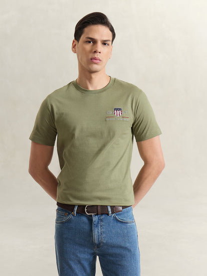 Refined and earthy, the GANT Men Olive Green Solid T-Shirt brings a muted, sophisticated colour tone to your casual wardrobe. The olive green shade is versatile and timeless, sitting beautifully alongside neutrals and earth tones. Solid in design and consistent in quality, this tee reflects GANT's dedication to crafting everyday essentials with lasting style. A subdued, thoughtful colour choice for the modern man.
