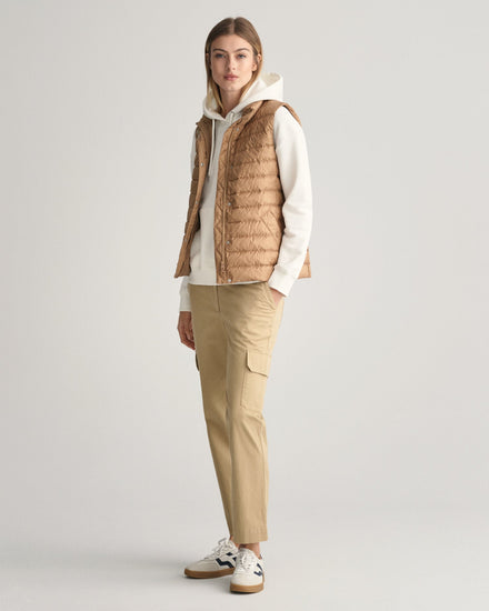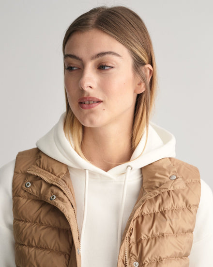 Elevate your wardrobe with this chic beige sleeveless jacket, crafted from eco-friendly recycled polyester. Featuring a sleek stand collar and a secure zip closure, it effortlessly combines style and sustainability. Its solid pattern offers versatility, making it the perfect layering piece for any occasion, from casual outings to sophisticated gatherings.