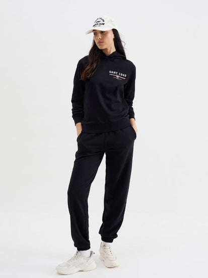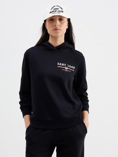 This sweatshirt for women is crafted in cotton and recycled polyester fabric. It comes in pull-on style with a hood and full sleeves. Fabric is stretchable and ribbed making it easy to move in. Designed in solid black with a graphic trend finish. Works well for daily wear or casual outings.