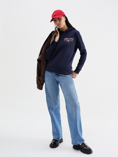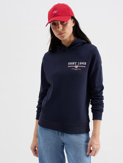 Give your closet a useful touch with this womens sweatshirt in evening blue. Made from cotton fabric with recycled polyester fibres. It has a hood and full sleeves. The ribbed finish adds comfort. The fabric is stretchable for easy movement. Solid trend style makes it simple to pair for daily or casual wear.