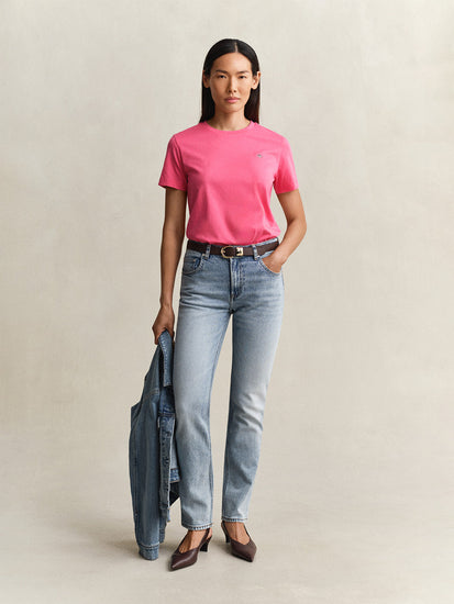 Elevate your everyday style with the GANT Women Pink Regular Fit Shield T-Shirt. Crafted with a flattering regular fit and a soft, breathable fabric, this t-shirt is perfect for all-day comfort and style. The iconic shield logo adds a touch of sophistication, while the vibrant pink hue adds a pop of color to any outfit. Whether you're running errands or meeting friends for lunch, this versatile tee is sure to become a wardrobe staple. Upgrade your casual look with the GANT Women Pink Regular Fit Shield T-Shirt today.
