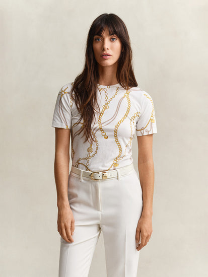 Elevate your casual wardrobe with the GANT Women White Printed Slim Fit Crew Neck T-Shirt. Crafted with a flattering slim fit design, this tee offers both style and comfort. The classic crew neck and chic white color make it a versatile staple for any outfit. The subtle printed detail adds a touch of sophistication, perfect for adding a pop of interest to your look. Made with high-quality materials, this t-shirt is both durable and stylish, making it a must-have for any fashion-forward woman. Upgrade your basics with this timeless piece that will effortlessly take you from day to night.