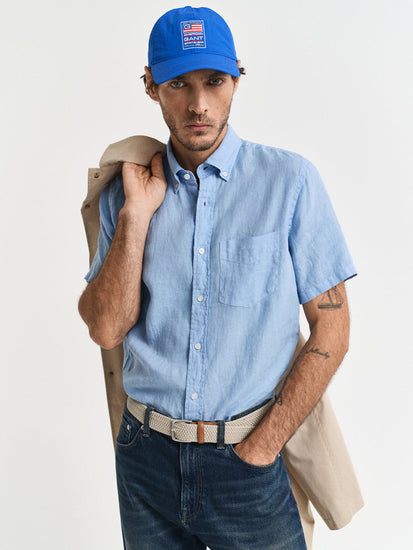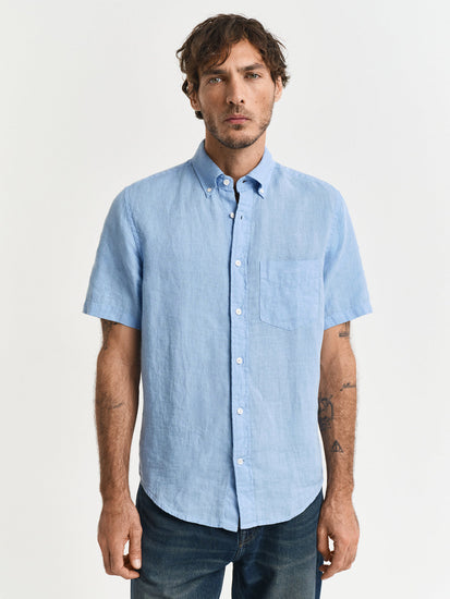 Stay cool and comfortable in this classic blue linen shirt. Featuring a regular fit, short sleeves, button-down collar, and button closure, this shirt is perfect for casual summer days. Made from breathable linen, it's lightweight and airy, ensuring you stay cool and stylish all day long.