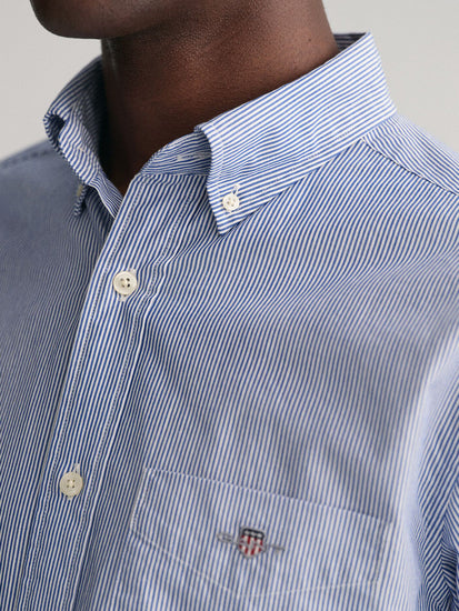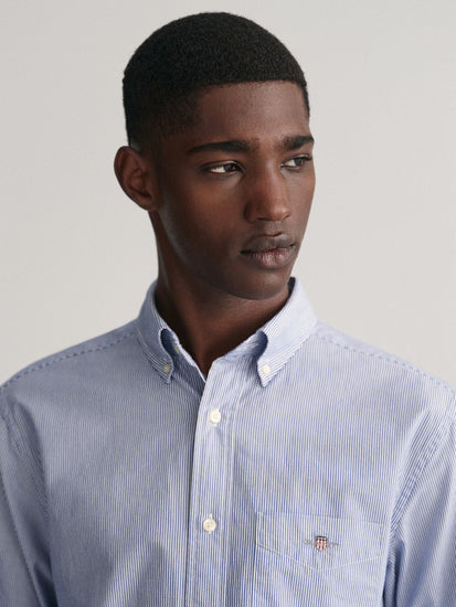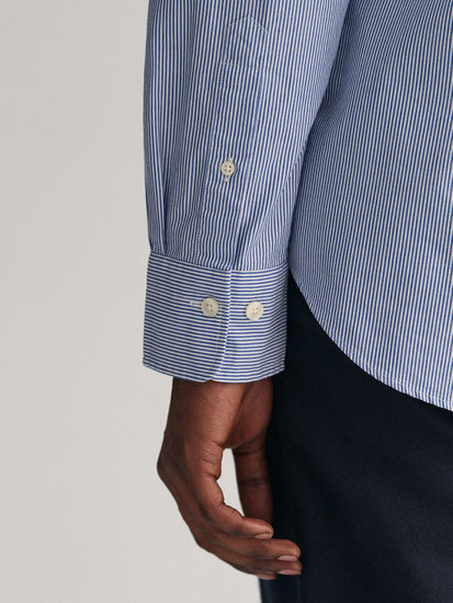 Discover timeless style with our classic poplin banker shirt in a sophisticated blue hue. Designed for the modern man, this shirt features a regular fit that offers comfort and elegance. The subtle striped pattern adds a touch of refinement, making it perfect for both business and casual settings. Crafted from pure cotton fabric, it ensures breathability and softness throughout the day. The full sleeves and button-down collar provide a polished look, while the button closure ensures a secure fit. Elevate your wardrobe with this versatile essential.