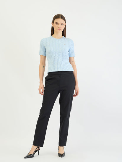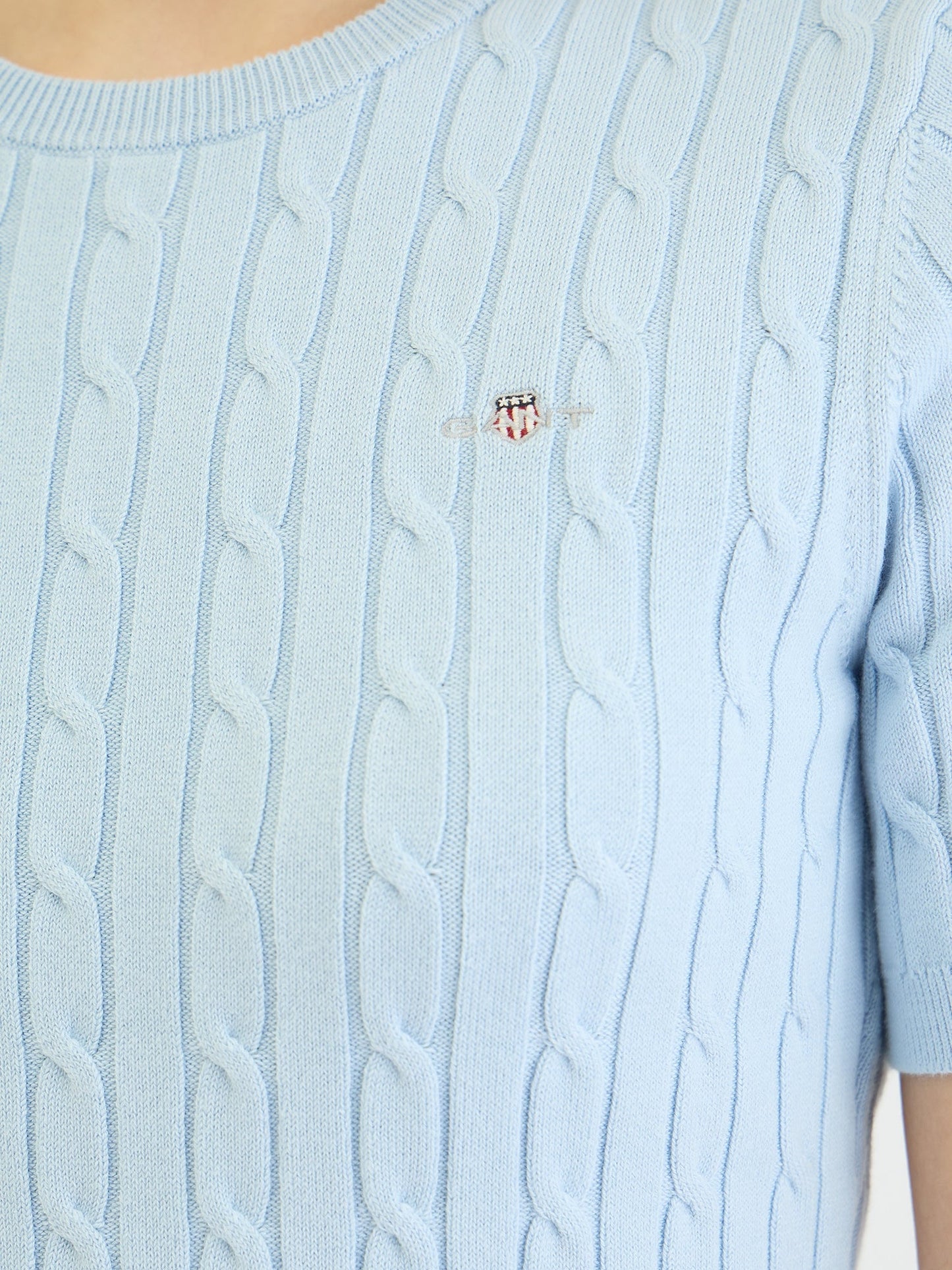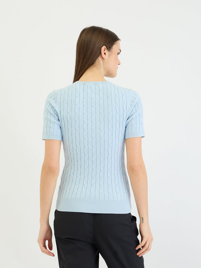 Embrace effortless style with this chic cable knit top. Crafted from a soft and comfortable cotton blend, this slim-fitting piece features a classic crew neck, short sleeves, and a timeless cable knit pattern. The slip-on closure ensures a smooth and easy fit. The rich blue hue adds a touch of sophistication, making it perfect for both casual and dressed-up occasions.