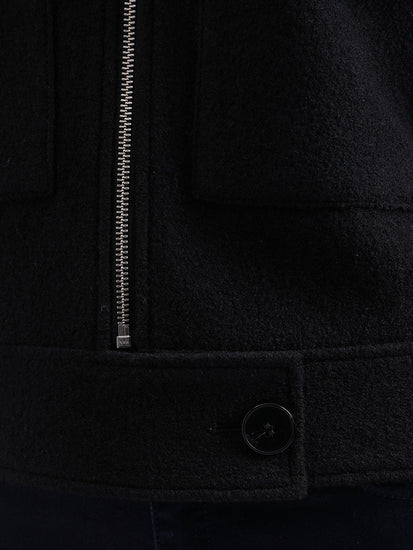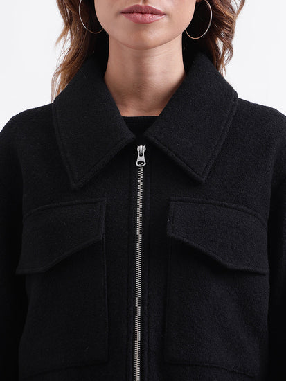 Drape yourself in understated luxury with this full-sleeved collar jacket. Made from a rich viscose blend, it offers a silky touch with optimal comfort. Its jet-black hue serves as a canvas of elegance, effortlessly elevating any ensemble it accompanies.