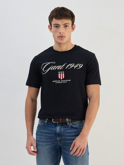 Elevate your everyday style with the GANT Men Black Solid Round Neck Regular Fit T-Shirt. Crafted from high-quality fabric, this classic tee offers a comfortable regular fit that flatters all body types. The timeless black color and solid design make it versatile for any occasion, while the round neckline adds a modern touch. Whether you are dressing it up with a blazer or keeping it casual with jeans, this t-shirt is a wardrobe staple that will keep you looking effortlessly stylish. Upgrade your basics with this must-have piece from GANT.